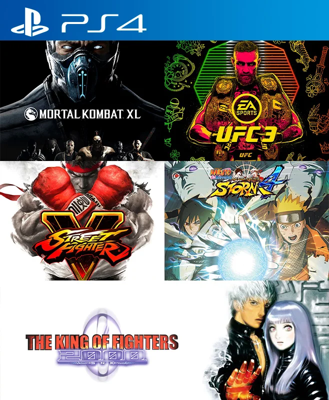 5 Juegos en 1 Mortal Kombat XL mas EA SPORTS UFC 3 Standard Edition mas STREET FIGHTER V mas NARUTO SHIPPUDEN Ultimate Ninja STORM 4 mas THE KING OF FIGHTERS 2000 PS4